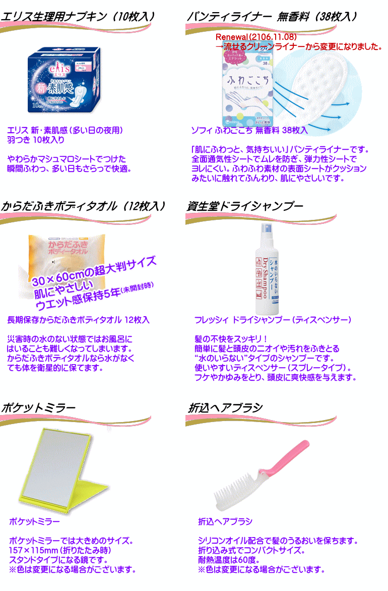 女性用 非常用持ちだし袋防災セット 被災者の声の形 メインセット レディースセレクション ●賞味期限、使用期限のあるものは同一期日ではありません。