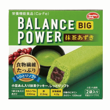 ソフトでおいしく、いつでもどこでも気軽にエネルギーチャージ!! バランスパワービッグ [抹茶あずき] 小豆あんを宇治抹茶入りのソフトクッキーで包み込みこんだ 和菓子風の栄養機能食品です。