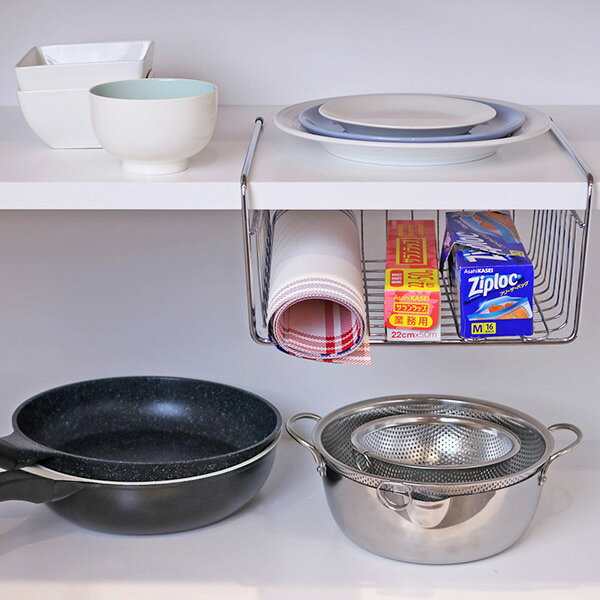 ●耐荷重:約2kg●取付部分のサイズ:奥行約25cm、高さ約3.2cm戸棚下の空間を収納スペースに棚板に挟むだけで簡単に収納ラックが取り付けられます。